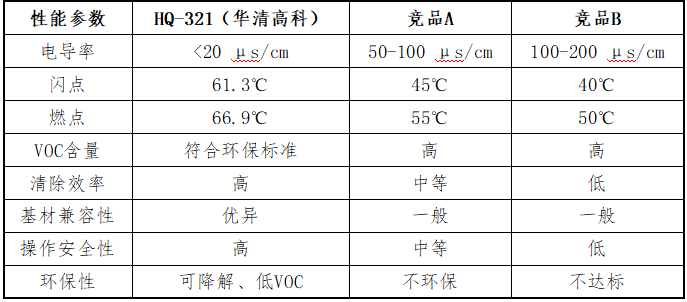 從上表可看出,HQ-321在電導(dǎo)率、閃點(diǎn)、環(huán)保性、清除效率及基材兼容性等方面全面優(yōu)于市場主流產(chǎn)品,展現(xiàn)出其在新能源汽車清洗領(lǐng)域的技術(shù)領(lǐng)先性。
