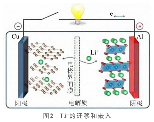 鋰離子電池最適宜的工作溫度是15~30℃,40℃以上要主動(dòng)放熱,0℃以下要加溫。從鋰電池機(jī)理上看,造成鋰離子電池低溫性能差的主要原因是隨著環(huán)境溫度的降低,電解液及電極界面膜對(duì)鋰離子轉(zhuǎn)移阻抗增大,此時(shí)Li+的遷移和負(fù)極碳隙的嵌入將變得十分困難,充放電性能因此變差(圖2),極端低溫情況甚至?xí)霈F(xiàn)電解液凍結(jié)、電池?zé)o法放電等現(xiàn)象,此類低溫容量損耗(-30℃以下)占電池總電量的19\%左右。