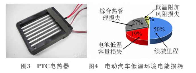 電動(dòng)汽車熱空調(diào)采用PTC電加熱器(圖3),其特點(diǎn)是功率大、制熱速度快,主流的暖風(fēng)空調(diào)功率在3~6kW,暖風(fēng)1h需耗費(fèi)3~6度電。以特斯拉Mod-elY為例,其百公里耗電大概13度電(kWh)左右,加熱系統(tǒng)的額外耗電及其綜合熱管理損失,使汽車?yán)m(xù)航能力下降幅度可達(dá)27\%左右,再加上低溫衰減的影響,實(shí)際的續(xù)航里程衰減可能要達(dá)到40\%~50\%(圖4)。