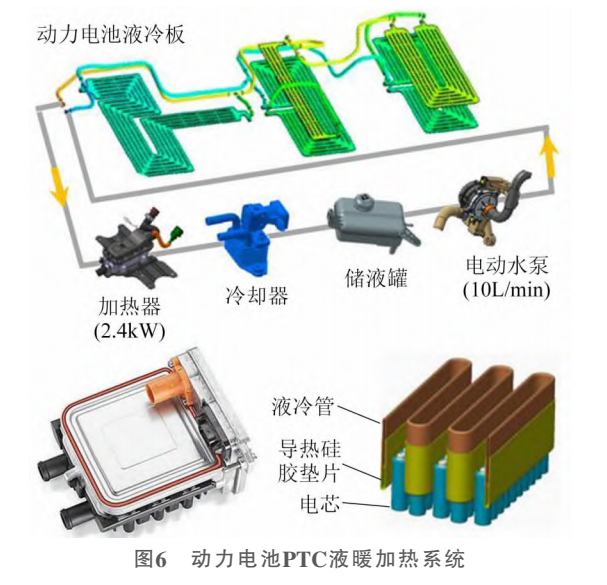 以空氣為介質(zhì)的風(fēng)暖因?qū)﹄姵亟M加熱不均勻而逐漸被淘汰,以液體為介質(zhì)的加熱均勻度較好,且可以利用電機(jī)、電機(jī)控制器、DC/DC產(chǎn)生的余熱幫助電池達(dá)到工作溫度,所以PTC液熱系統(tǒng)逐漸成為當(dāng)前空調(diào)及動(dòng)力電池加熱(圖6)的主流技術(shù),但此種方式耗電量大也是新能源汽車的一個(gè)痛點(diǎn)。目前在電池本身耐低溫性能沒有突破的情況下,采取的措施是提高電能的制熱效率。