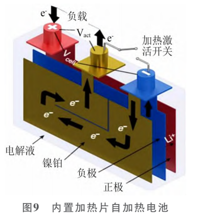 美國賓西法尼亞州立大學(xué)王朝陽教授團(tuán)隊(duì)采用將加熱片置于電池芯內(nèi)的技術(shù),即全氣候自加熱型鋰電池(簡稱ACB),加熱片(鎳鉑片:厚度50μm在25℃時(shí)電阻為56mΩ)與電池正負(fù)極連接,利用電池自身的能量使其快速升溫,溫度升高后即可在低溫環(huán)境下進(jìn)行充電或行車,可徹底解決電池低溫瓶頸問題(圖9)。因該方案采用物理加熱方法,對(duì)電池壽命影響小,且加熱過程不依賴外部設(shè)備。