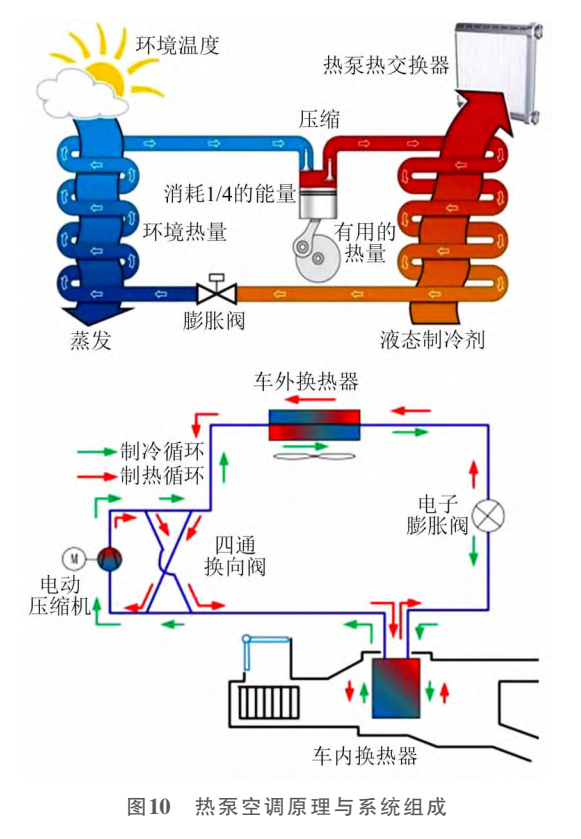 汽車熱泵空調(diào)系統(tǒng)在處于采暖循環(huán)時(shí),車外換熱器作為蒸發(fā)器使用,吸收外界環(huán)境的熱量,高溫高壓的制冷劑流過熱泵熱交換器時(shí),制冷劑釋放的熱能用于加熱乘客艙。熱泵通過搬運(yùn)環(huán)境的熱量,使得采暖系統(tǒng)效率達(dá)到1.3~2.0,節(jié)省30\%~50\%的空調(diào)功耗,測試表明:在-7℃時(shí),R134a熱泵相較于PTC制熱可提升20\%續(xù)航里程。