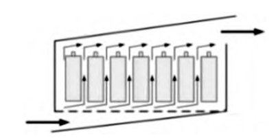 這一冷卻技術(shù)選擇空氣作為冷卻介質(zhì),借助對(duì)流熱交換原理來達(dá)到電池組降溫的目的??諝饫鋮s電池技術(shù)本身具備維護(hù)成本低、制造成本低廉的應(yīng)用特點(diǎn),因此可以被廣泛應(yīng)用于動(dòng)力電池的保護(hù)裝置。同時(shí)空氣冷卻電池技術(shù)在應(yīng)用過程中也存在受到空氣比熱容以及導(dǎo)熱系數(shù)性質(zhì)的制約,為此空氣冷卻電池技術(shù)的電池組冷卻效率并不高?,F(xiàn)階段主要應(yīng)用冷卻空氣流動(dòng)路徑為從底部流入、從頂部流出(如圖1所示),這一流動(dòng)路徑選擇是側(cè)方流入另一方流出冷卻效率的 2 倍。
