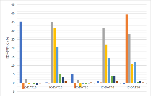 標準橡膠配方在這些液體中浸泡后的體積變化表明,大多數被測橡膠配方都有明顯的變化??梢钥闯?,在所有的被測材料中,只有代碼為IC-DAT41的配方才是合適的候選配方。