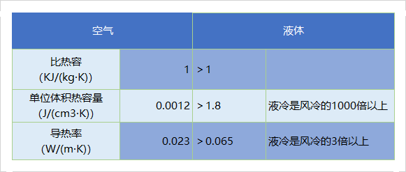 相較于風(fēng)冷以空氣為冷卻媒介,通過風(fēng)扇和壓縮制冷,液體的比熱容遠(yuǎn)高于空氣,單位體積熱容量是風(fēng)冷的1000倍以上,熱量傳導(dǎo)效率更高。