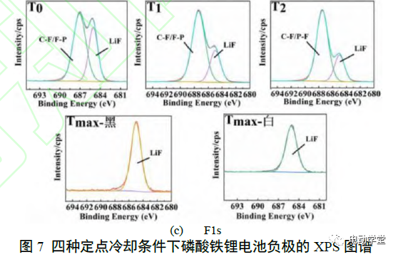 圖7(c)為四種定點冷卻條件下磷酸鐵鋰電池負極的F1sXPS圖譜。在溫度達到T0時,負極表面的F存在C-F、F-P、LiF三種形式,其中,C-F代表著含氟有機物的生成;F-P代表殘留電解質(zhì)鹽LiPF6的存在以及相應(yīng)分解產(chǎn)物PFx的存在。