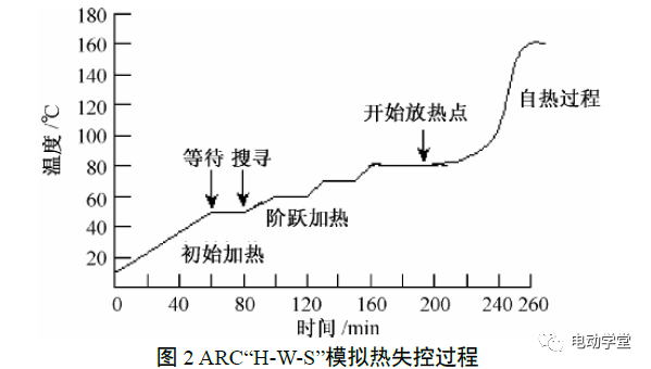 本實驗采用ARC的典型工作模式為“加熱-等待-搜尋”模式,如圖2所示。通過加熱電池,直至檢測到電池自產(chǎn)熱之后,再進入絕熱跟蹤階段,從而保持絕熱測試環(huán)境,使得電池產(chǎn)生的熱量完全被電池吸收并造成電池溫升。