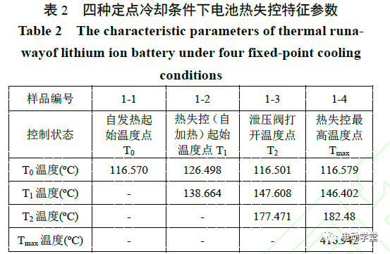 因此本次實驗針對熱失控過程中的四個關(guān)鍵溫度點進行分析,分別為:自發(fā)熱起始溫度點T0、熱失控(自加熱)起始溫度點T1、泄壓閥打開溫度點T2、熱失控最高溫度點Tmax。四種定點冷卻熱失控實驗過程曲線如圖3所示。相關(guān)熱失控特征參數(shù)統(tǒng)計如表2所示。