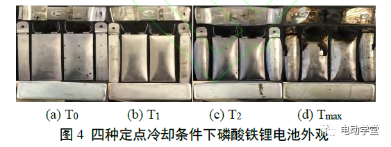 圖4顯示了四種定點冷卻條件下磷酸鐵鋰電池的外觀??梢园l(fā)現(xiàn),隨著熱失控過程的進行,磷酸鐵鋰電池鼓脹程度逐漸加劇,電池熱失控結(jié)束后盡管外包裝仍然存在,但有明顯燒蝕現(xiàn)象。電池泄壓閥打開后,大量電池燃燒產(chǎn)物附著在殼體外部。