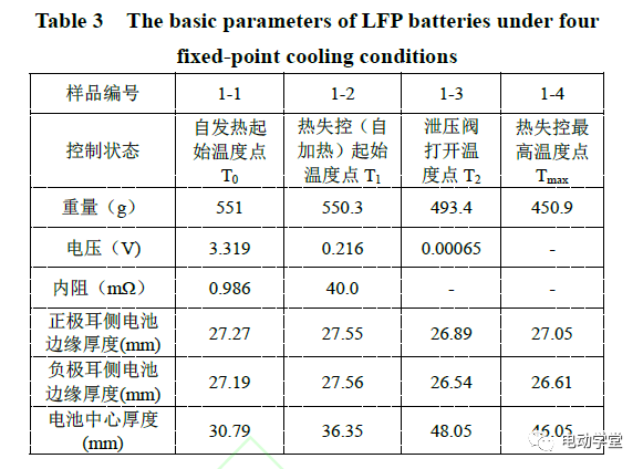 對比四種條件下的磷酸鐵鋰電池基本參數(shù),如表3所示??芍?,隨著絕熱熱失控的進行,電池重量逐漸降低,內(nèi)阻逐漸增加,中心厚度有明顯增長,開路電壓逐漸降低,且在達到熱失控溫度點后電池電壓急劇降低至0V。
