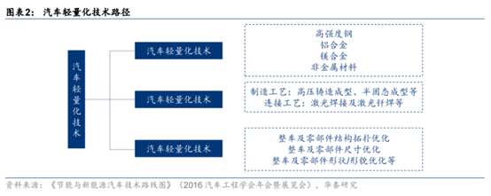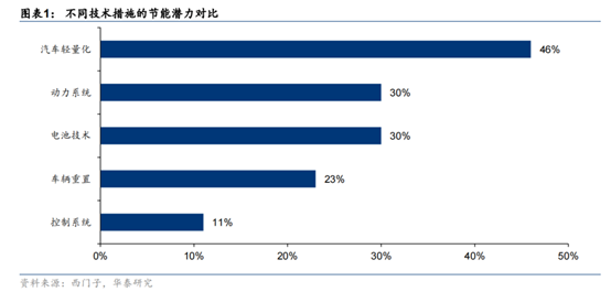 車身輕量化是降低燃料消耗的主要手段,據(jù)西門子發(fā)布的不同技術(shù)措施的節(jié)能潛力對比中,輕量化以46%位居榜首。據(jù)《新能源汽車輕量化的關(guān)鍵技術(shù)研究》,新能源汽車自身重量降低20%,將增加5%-10%的續(xù)航能力。