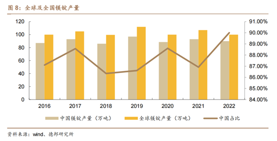 鎂在自然界中以化合態(tài)存在,我國鎂儲量占世界第一,已探明的白云石礦資源總量為40億噸。我國鎂錠產(chǎn)量占全球比例較高,據(jù)Wind數(shù)據(jù),2022年全球鎂錠產(chǎn)量100萬噸,其中中國鎂錠產(chǎn)量90萬噸,占比高達(dá)90%。