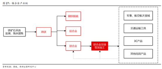 鎂金屬產(chǎn)業(yè)鏈上游環(huán)節(jié)主要是將自然界中各種形式存在的鎂提純加工成原鎂,中游制造環(huán)節(jié)則是將原鎂加工處理,以待實(shí)際應(yīng)用,加工方式包括制造鎂合金、金屬還原、煉鋼脫硫等。
