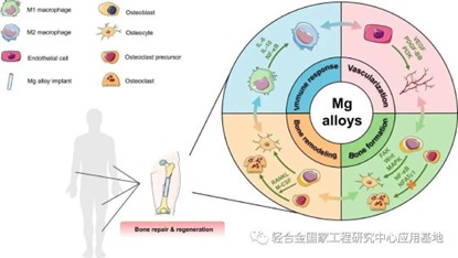 對于骨愈合的成功,良好的免疫微環(huán)境調(diào)控、血運(yùn)重建和骨重塑是非常關(guān)鍵的。在骨愈合的過程中,炎癥、修復(fù)和重塑是連續(xù)而部分重疊的三個階段。不同譜系的細(xì)胞,包括免疫細(xì)胞、成血管相關(guān)細(xì)胞、成骨細(xì)胞、骨細(xì)胞和破骨細(xì)胞等,依次參與其中。鎂合金能夠以不同的方式與這些細(xì)胞相互作用,從而實現(xiàn)對骨愈合的全面調(diào)控。圖1展示了這種相互作用的概述。因此,這篇綜述從免疫調(diào)控、血管再生、成骨和破骨細(xì)胞功能調(diào)控四個方面系統(tǒng)地總結(jié)了鎂合金在骨愈合機(jī)制中的作用。通過深入了解這些機(jī)制,我們可以更好地理解鎂合金在骨修復(fù)中的作用,并為進(jìn)一步的研究和臨床應(yīng)用提供方向和指導(dǎo)。