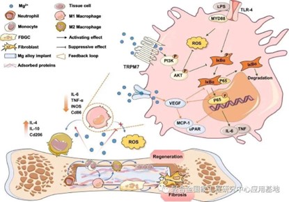 鎂合金在免疫反應(yīng)中,特別是巨噬細(xì)胞的極化行為上具有雙向調(diào)控的作用。在植入早期,鎂合金參與了一系列炎癥活化過程,包括蛋白吸附、炎癥細(xì)胞募集、單核細(xì)胞分化、巨噬細(xì)胞M1表型極化和吞噬作用等。當(dāng)鎂合金降解穩(wěn)定后,適當(dāng)釋放的鎂離子、氫氧根和氫氣可以促進(jìn)巨噬細(xì)胞向M2表型極化轉(zhuǎn)變,從而創(chuàng)造出有利于組織再生的抑炎免疫微環(huán)境。在這個過程中,TRPM7/PI3K/AKT1s、TLR-4/MYD88/NF-κB等信號通路的活化起到了關(guān)鍵作用。在良好的免疫微環(huán)境塑造下,M2型巨噬細(xì)胞與間充質(zhì)干細(xì)胞等骨愈合相關(guān)細(xì)胞相互作用,促進(jìn)骨再生,并參與缺損部位的血管再生過程。圖2展示了鎂合金通過調(diào)控巨噬細(xì)胞極化來塑造骨愈合微環(huán)境的作用及其潛在機(jī)制。通過了解這些調(diào)控機(jī)制,我們可以更好地利用鎂合金來促進(jìn)骨愈合,并為臨床應(yīng)用提供更多的可能性。