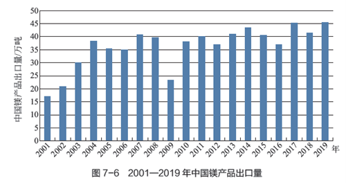 根據(jù)中國(guó)有色金屬工業(yè)協(xié)會(huì)的統(tǒng)計(jì)數(shù)據(jù)顯示,2019年我國(guó)的原鎂產(chǎn)量為96.9萬噸,較去年增長(zhǎng)了12.2%。目前,全球約有45%的原鎂用于生產(chǎn)鎂合金,其中70%用于汽車行業(yè),20%用于3C電子產(chǎn)品,而10%則應(yīng)用于軍工等領(lǐng)域。如圖7-6所示,2019年我國(guó)出口的原鎂和鎂制品數(shù)量達(dá)到了45.16萬噸,占全球總產(chǎn)量的53%。在鎂合金的深加工產(chǎn)品中,壓鑄方式仍然占主導(dǎo)地位,但存在一定的局限性,制約了鎂合金應(yīng)用的大規(guī)模擴(kuò)展。因此,進(jìn)一步攻關(guān)變形鎂合金產(chǎn)品的加工技術(shù)和應(yīng)用技術(shù)顯得尤為重要。