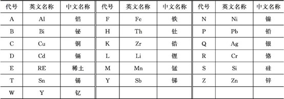 關(guān)于鎂合金的命名方式,目前國(guó)際上傾向于采用美國(guó)材料試驗(yàn)協(xié)會(huì)(ASTM)的方法。根據(jù)ASTM命名法,鎂合金的名稱由字母-數(shù)字-字母三部分組成。第一部分是由1~2種主要合金元素的代號(hào)組成,按含量高低的順序排列。具體的合金元素代號(hào)請(qǐng)參考表1。第二部分是這些元素的質(zhì)量百分比,按元素代號(hào)的順序排列。鎂合金的牌號(hào)中的兩位數(shù)字表示主要合金元素的名義質(zhì)量百分比,四舍五入取最接近的整數(shù)。字母的排列順序根據(jù)實(shí)際合金中元素的含量多少來(lái)確定,含量較高的元素排在前面。如果兩種元素的含量相同,則按照英文字母的先后順序排列。然而,這種命名方式的局限性在于無(wú)法表示其他意圖添加的元素。因此,這個(gè)體系需要改進(jìn)。第三部分的后綴字母A、B、C、D、E等表示成分和特定范圍的純度變化,同時(shí)也表示鎂合金發(fā)展的不同階段。例如,AZ91E表示主要合金元素為鋁和鋅,其名義含量分別為9%和1%,E表示它是AZ91合金系列中的第五個(gè)變種。