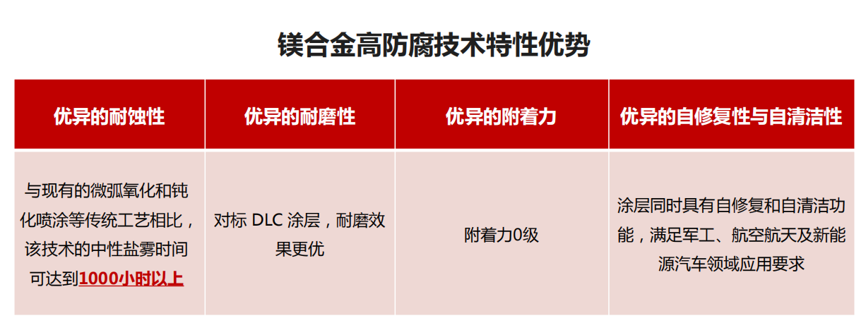 ①優(yōu)異的耐蝕性:與現(xiàn)有的微弧氧化和鈍化噴涂等傳統(tǒng)工藝相比,該技術的中性鹽霧時間可達到500-1000小時以上(不同鎂合金牌號)